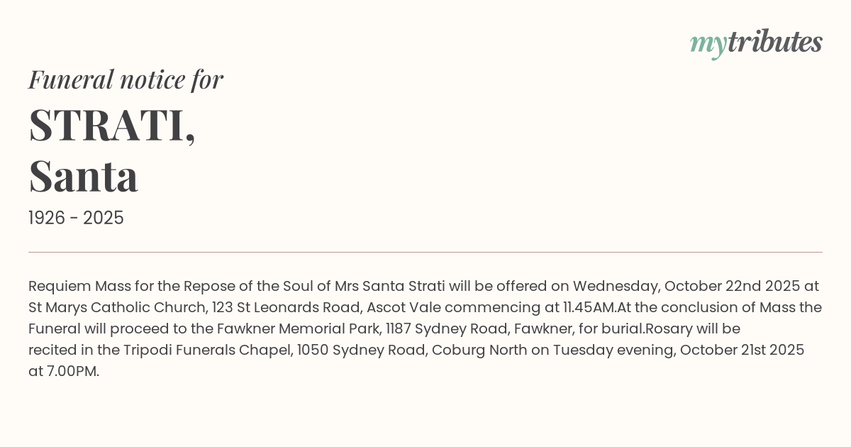 16°CRequiem Mass for the Repose of the Soul of Mrs Santa Strati will be offered on Wednesday, October 22nd 2025 at St Mary’s Catholic Church, 123 St Leonards Road, Ascot Vale commencing at 11.45AM.