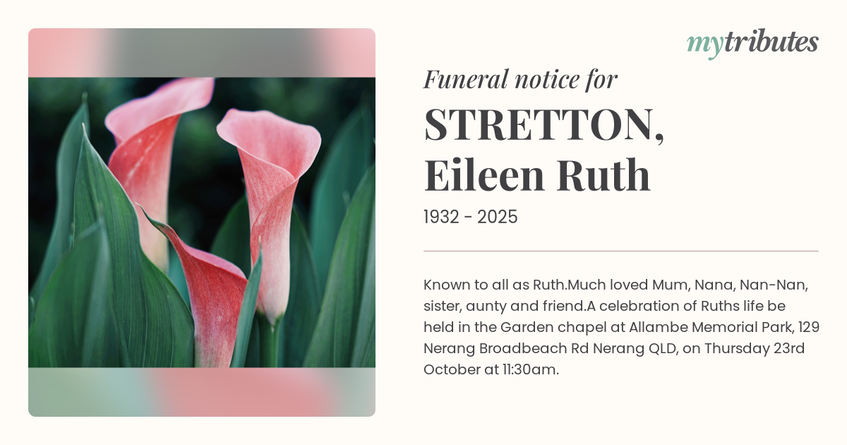 A celebration of Ruth’s life be held in the Garden chapel at Allambe Memorial Park, 129 Nerang Broadbeach Rd Nerang QLD, on Thursday 23rd October at 11:30am.