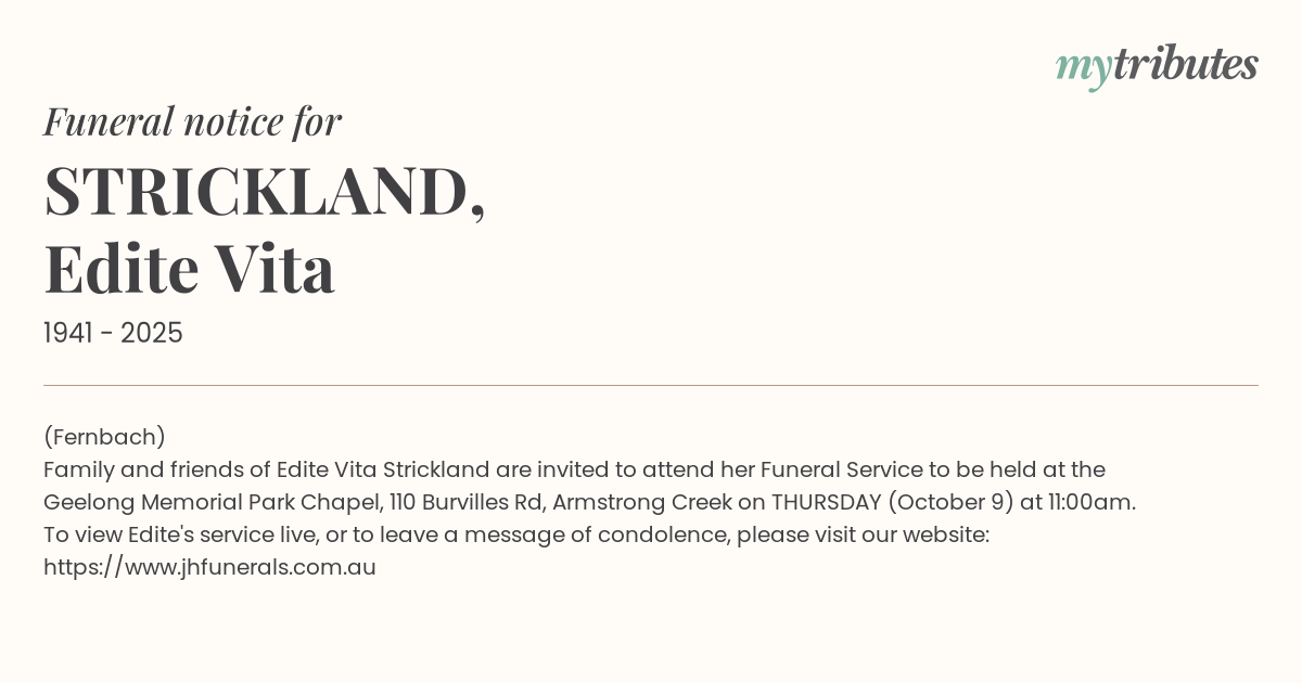 Family and friends of Edite Vita Strickland are invited to attend her Funeral Service to be held at the Geelong Memorial Park Chapel, 110 Burvilles Rd, Armstrong Creek on THURSDAY (October 9) at 11:00am.