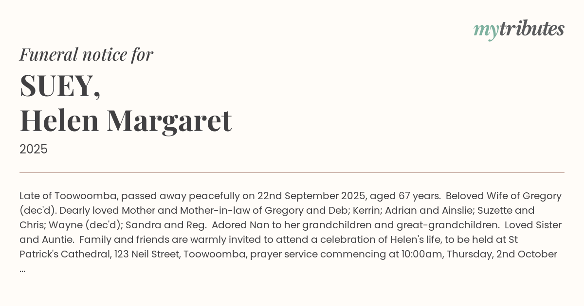 Family and friends are warmly invited to attend a celebration of Helen's life, to be held at St Patrick's Cathedral, 123 Neil Street, Toowoomba, prayer service commencing at 10:00am, Thursday, 2nd October 2025, followed by interment at the Toowoomba Garden of Remembrance.