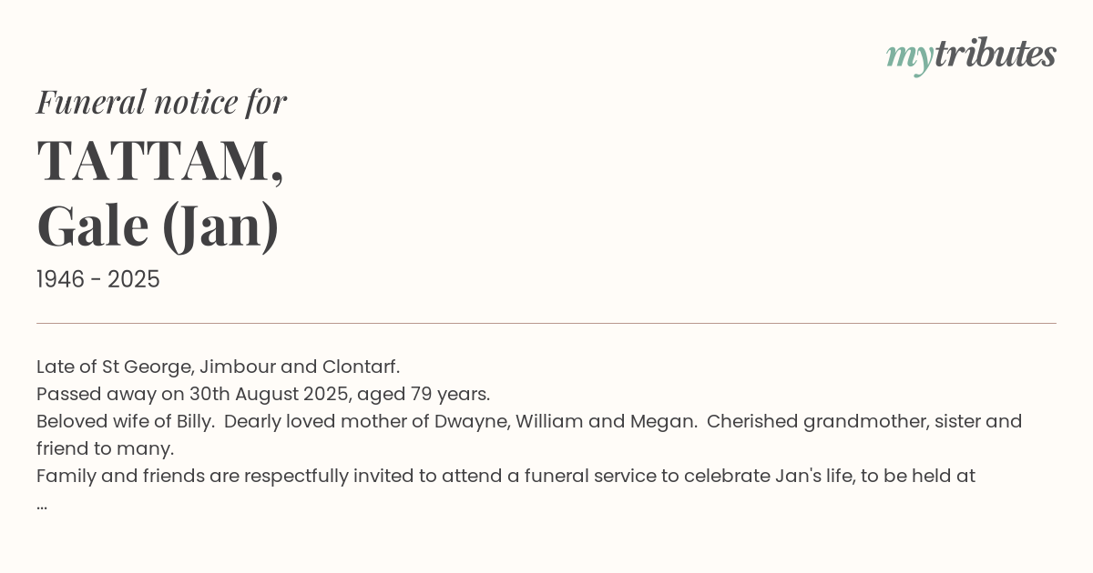 16°CLate of St George, Jimbour and Clontarf. Passed away on 30th August 2025, aged 79 years. Beloved wife of Billy. Dearly loved mother of Dwayne, William and Megan. Cherished grandmother, sister and friend to many. Family and friends are respectfully invited to attend a funeral service to celebrate Jan's life, to be held at St Peter the Fisherman Anglican Church, 13 Lucinda Street, Clontarf, on Friday 12th September 2025, commencing at 2.00pm.