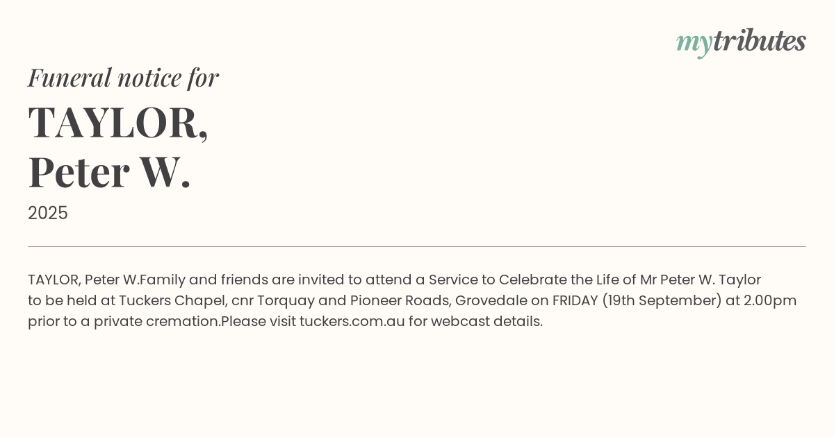Mr Peter W. Taylor to be held at Tuckers Chapel, cnr Torquay and Pioneer Roads, Grovedale on FRIDAY (19th September) at 2.00pm prior to a private cremation.