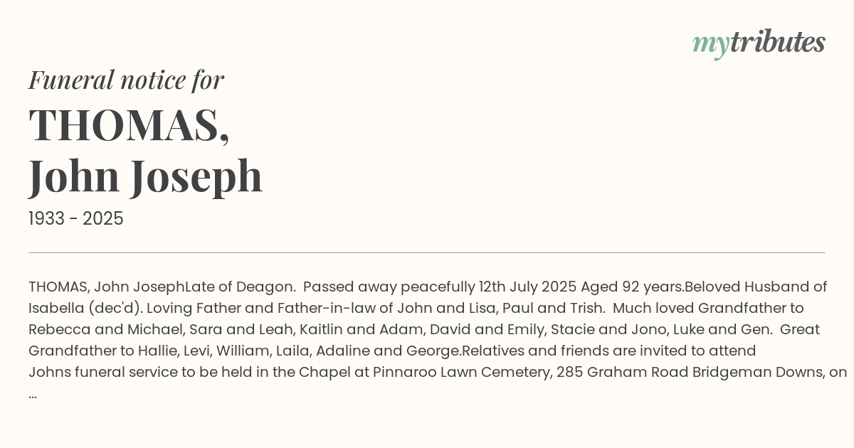 Relatives and friends are invited to attend John’s funeral service to be held in the Chapel at Pinnaroo Lawn Cemetery, 285 Graham Road Bridgeman Downs, on Friday 25th July 2025 commencing