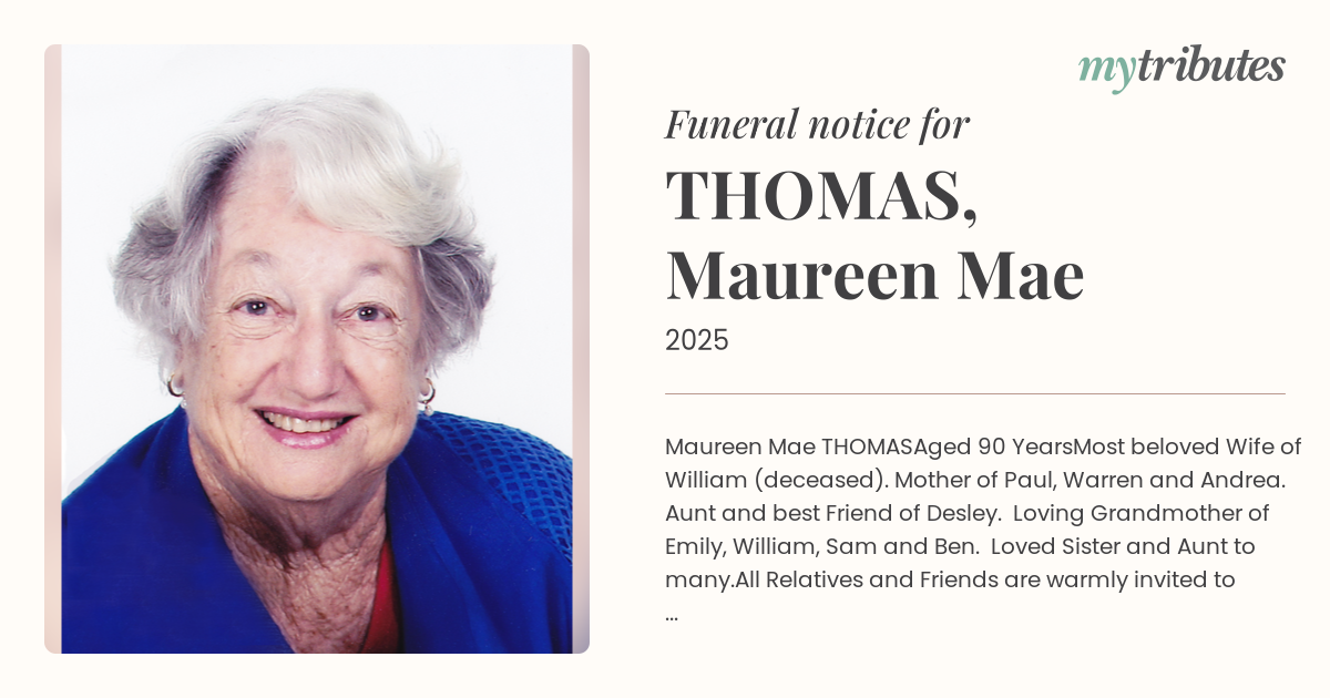 All Relatives and Friends are warmly invited to attend MAUREEN'S FUNERAL SERVICE which will commence at 10.00 a.m. TUESDAY MORNING 30th SEPTEMBER, 2025 at the Lakes Chapel, Morleys Funeral Home, Cnr. Hugh Street and Martinez Avenue, Townsville.