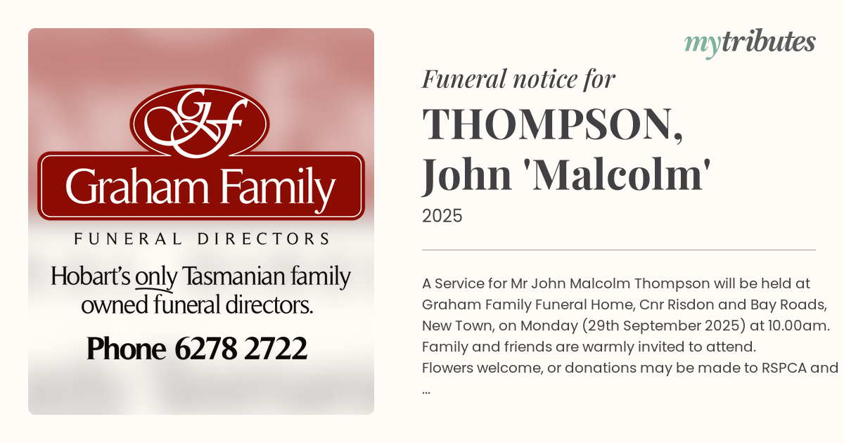 16°CA Service for Mr John ‘Malcolm’ Thompson will be held at Graham Family Funeral Home, Cnr Risdon and Bay Roads, New Town, on Monday (29th September 2025) at 10.00am. Family and friends are warmly invited to attend. Flowers welcome, or donations may be made to RSPCA and will be gratefully received at the Service. To access the livestream of this service please go to https://www.grahamfamilyfunerals.com.au/funerals Private Cremation.