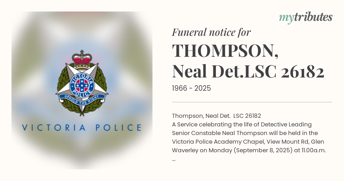 A Service celebrating the life of Detective Leading Senior Constable Neal Thompson will be held in the Victoria Police Academy Chapel, View Mount Rd, Glen Waverley on Monday (September 8, 2025) at 11.00a.m.