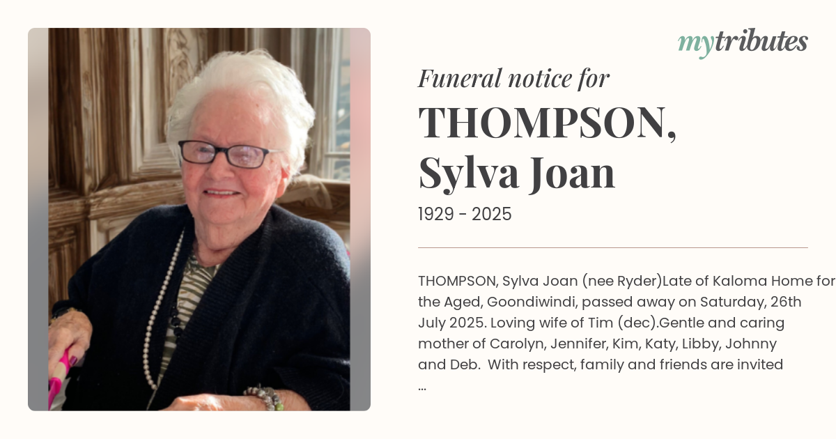 With respect, family and friends are invited to honour Joan's life at St Mary's Catholic Church, Goondiwindi, on Friday, 8th August 2025, with a Requiem Mass commencing at Midday.