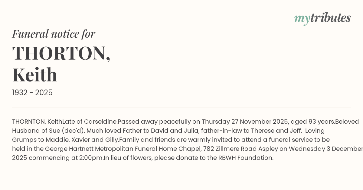 Family and friends are warmly invited to attend a funeral service to be held in the George Hartnett Metropolitan Funeral Home Chapel, 782 Zillmere Road Aspley on Wednesday 3 December 2025 commencing at 2:00pm.