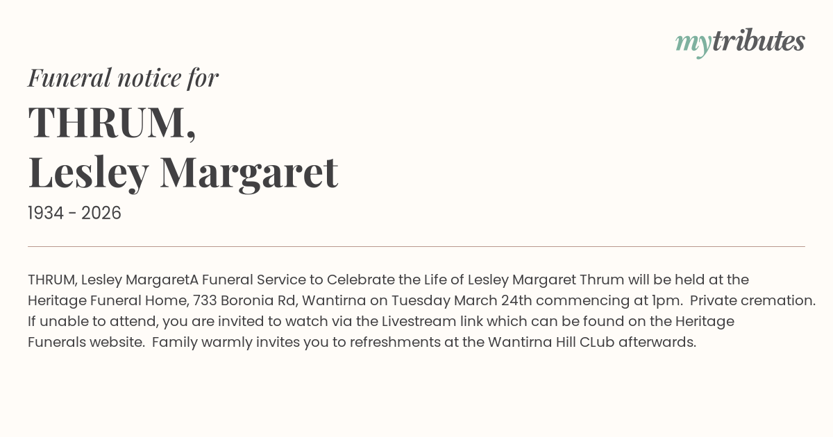 A Funeral Service to Celebrate the Life of Lesley Margaret Thrum will be held at the Heritage Funeral Home, 733 Boronia Rd, Wantirna on Tuesday March 24th commencing at 1pm. Private cremation.