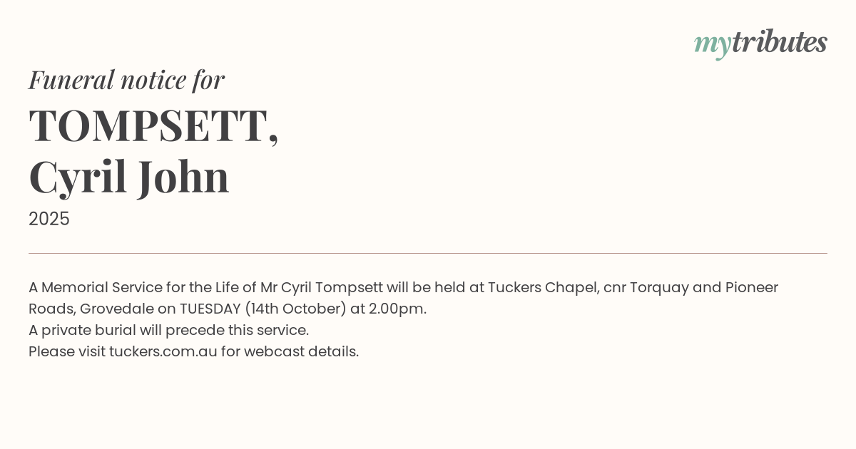 16°CA Memorial Service for the Life of Mr Cyril Tompsett will be held at Tuckers Chapel, cnr Torquay and Pioneer Roads, Grovedale on TUESDAY (14th October) at 2.00pm.
