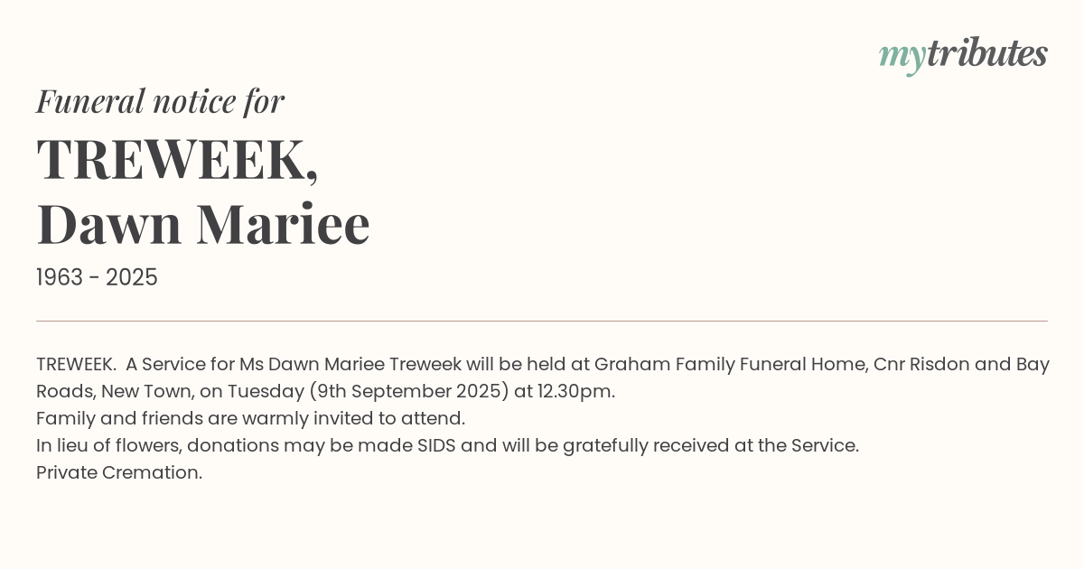 16°CTREWEEK. A Service for Ms Dawn Mariee Treweek will be held at Graham Family Funeral Home, Cnr Risdon and Bay Roads, New Town, on Tuesday (9th September 2025) at 12.30pm.