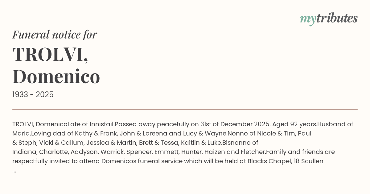 Family and friends are respectfully invited to attend Domenico’s funeral service which will be held at Black’s Chapel, 18 Scullen Avenue, Innisfail on Thursday 15th January 2025 commencing at 10:30am