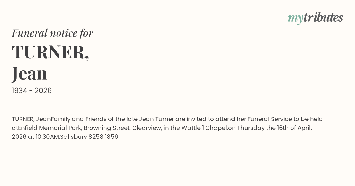 Family and Friends of the late Jean Turner are invited to attend her Funeral Service to be held at