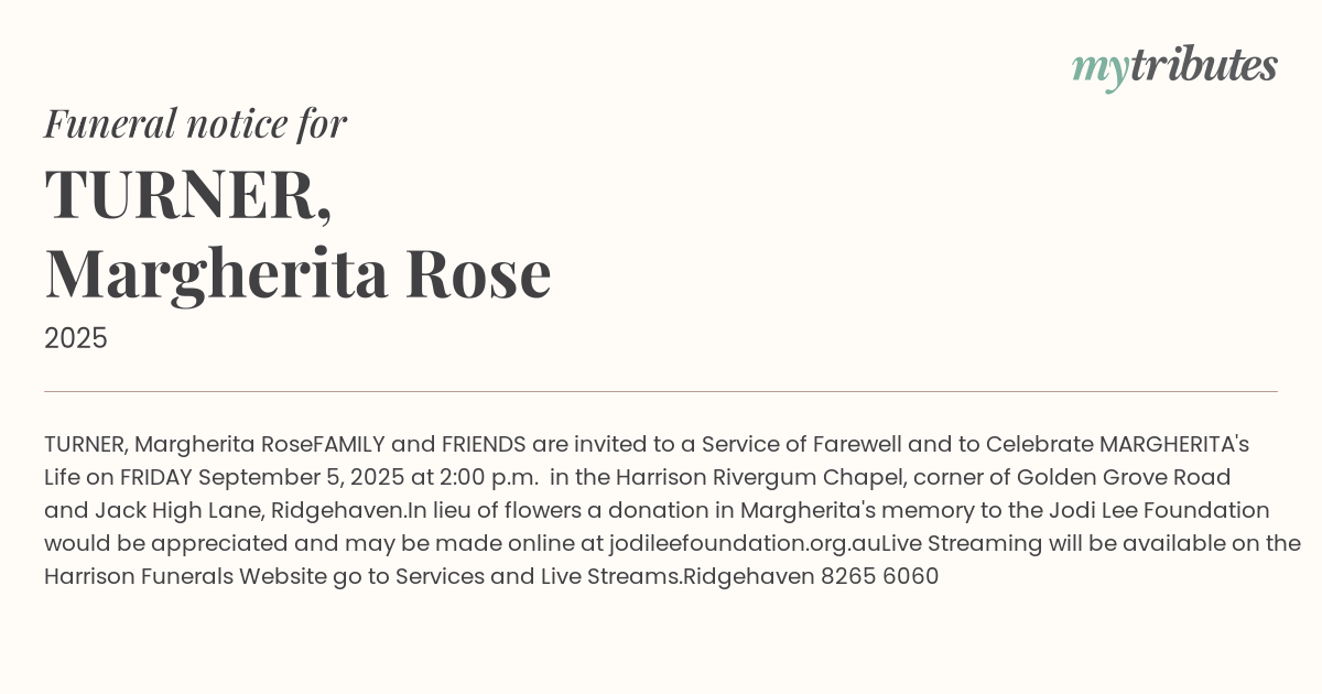 FAMILY and FRIENDS are invited to a Service of Farewell and to Celebrate MARGHERITA's Life on FRIDAY September 5, 2025 at 2:00 p.m. in the Harrison Rivergum Chapel, corner of Golden Grove Road and Jack High Lane, Ridgehaven.