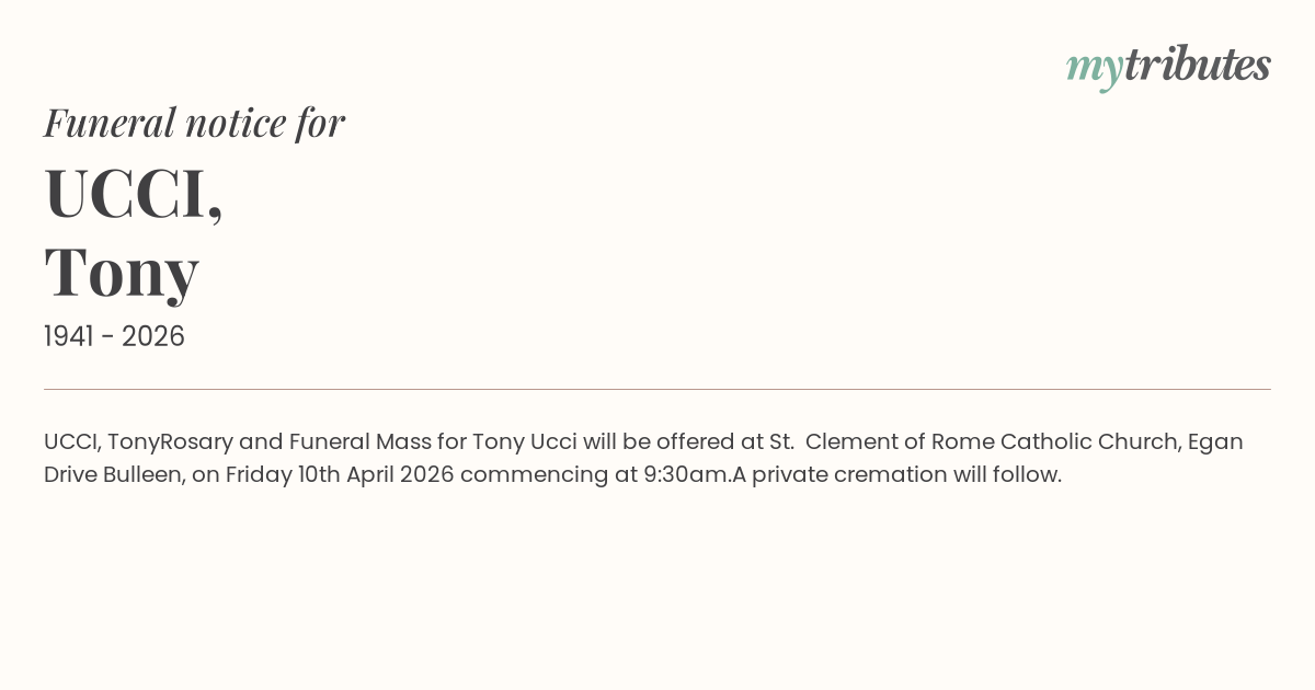 Rosary and Funeral Mass for Tony Ucci will be offered at St. Clement of Rome Catholic Church, Egan Drive Bulleen, on Friday 10th April 2026 commencing at 9:30am.