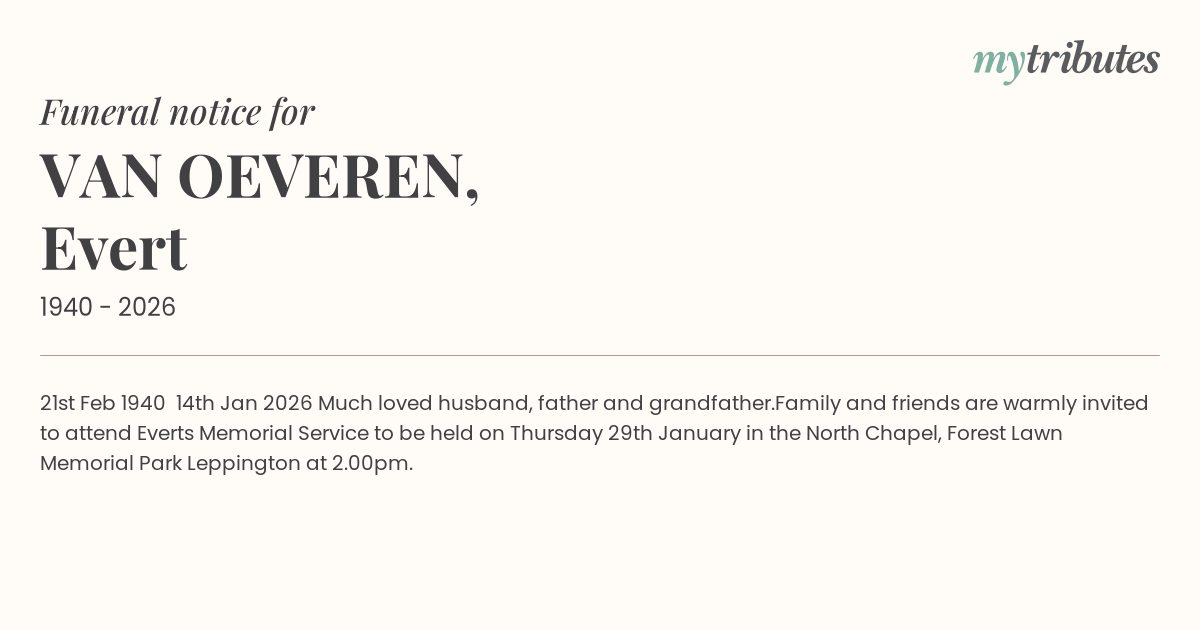 Family and friends are warmly invited to attend Evert’s Memorial Service to be held on Thursday 29th January in the North Chapel, Forest Lawn Memorial Park Leppington at 2.00pm.
