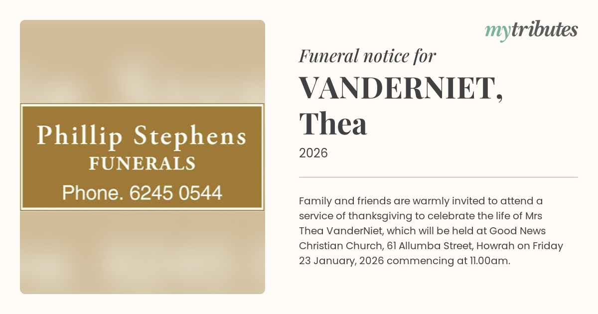 16°CFamily and friends are warmly invited to attend a service of thanksgiving to celebrate the life of Mrs Thea VanderNiet, which will be held at Good News Christian Church, 61 Allumba Street, Howrah on Friday 23 January, 2026 commencing at 11.00am.