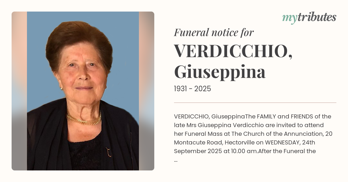 The FAMILY and FRIENDS of the late Mrs Giuseppina Verdicchio are invited to attend her Funeral Mass at The Church of the Annunciation, 20 Montacute Road, Hectorville on WEDNESDAY, 24th September 2025 at 10.00 am.