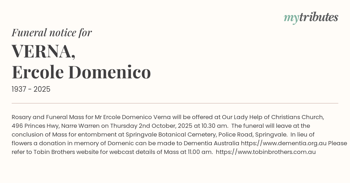 16°CRosary and Funeral Mass for Mr Ercole Domenico Verna will be offered at Our Lady Help of Christians Church, 496 Princes Hwy, Narre Warren on Thursday 2nd October, 2025 at 10.30 am.