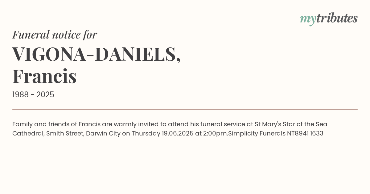 16°CFamily and friends of Francis are warmly invited to attend his funeral service at St Mary's Star of the Sea Cathedral, Smith Street, Darwin City on Thursday 19.06.2025 at 2:00pm.