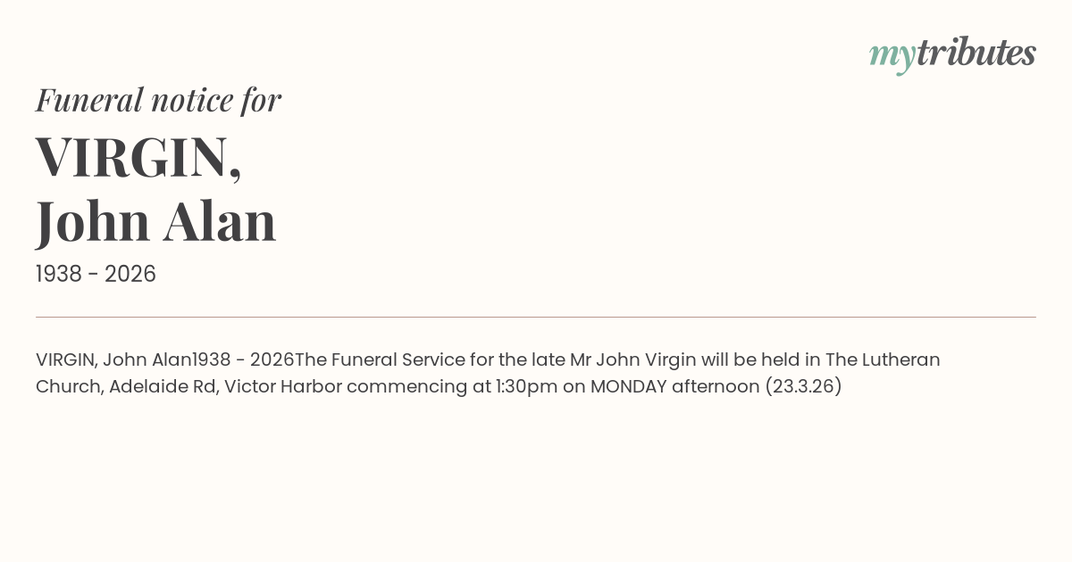 The Funeral Service for the late Mr John Virgin will be held in The Lutheran Church, Adelaide Rd, Victor Harbor commencing at 1:30pm on MONDAY afternoon (23.3.26)