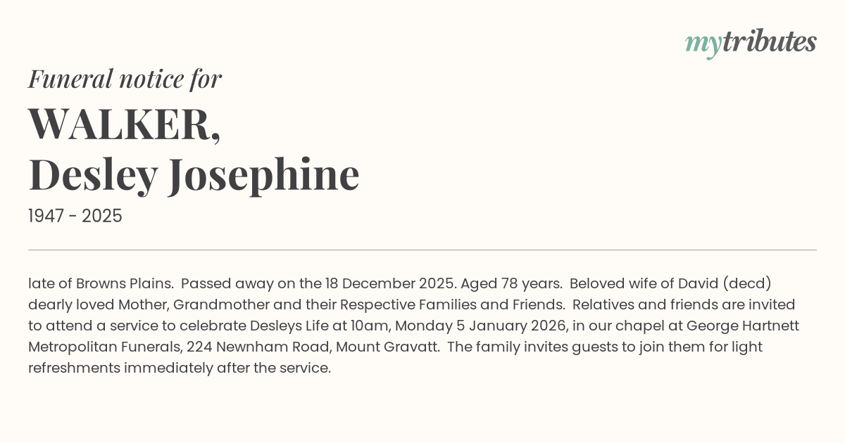 16°Clate of Browns Plains. Passed away on the 18 December 2025. Aged 78 years. Beloved wife of David (dec’d) dearly loved Mother, Grandmother and their Respective Families and Friends. Relatives and friends are invited to attend a service to celebrate Desley’s Life at 10am, Monday 5 January 2026, in our chapel at George Hartnett Metropolitan Funerals, 224 Newnham Road, Mount Gravatt. The family invites guests to join them for light refreshments immediately after the service.