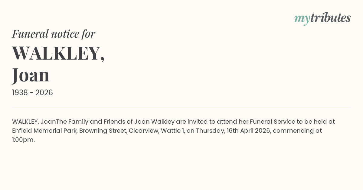 The Family and Friends of Joan Walkley are invited to attend her Funeral Service to be held at Enfield Memorial Park, Browning Street, Clearview, Wattle 1, on