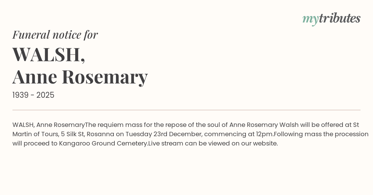 The requiem mass for the repose of the soul of Anne Rosemary Walsh will be offered at St Martin of Tours, 5 Silk St, Rosanna on Tuesday 23rd December, commencing at 12pm.