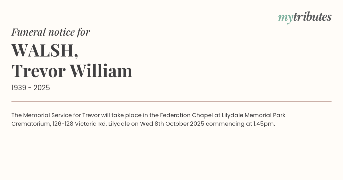 16°CThe Memorial Service for Trevor will take place in the Federation Chapel at Lilydale Memorial Park Crematorium, 126-128 Victoria Rd, Lilydale on Wed 8th October 2025 commencing at 1.45pm.
