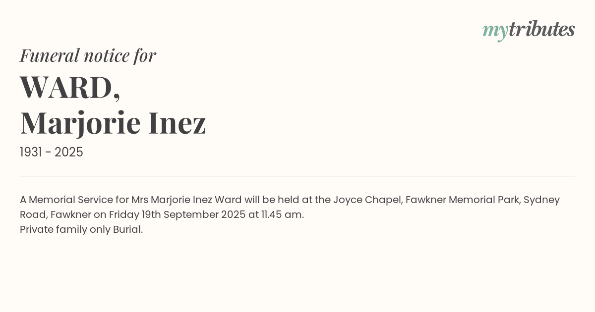 16°CA Memorial Service for Mrs Marjorie Inez Ward will be held at the Joyce Chapel, Fawkner Memorial Park, Sydney Road, Fawkner on Friday 19th September 2025 at 11.45 am.