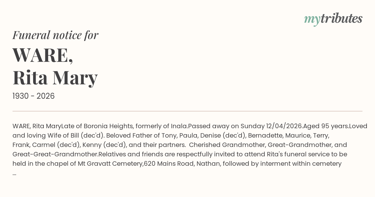 Relatives and friends are respectfully invited to attend Rita's funeral service to be held in the chapel of Mt Gravatt Cemetery,
