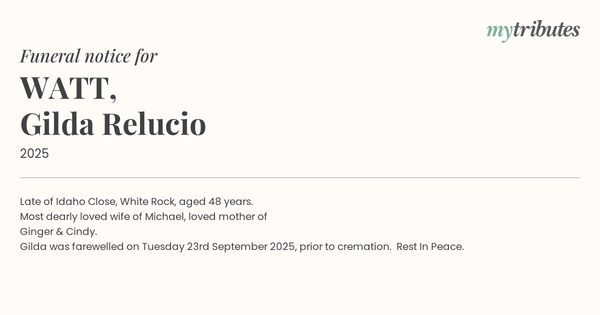 Gilda was farewelled on Tuesday 23rd September 2025, prior to cremation. Rest In Peace.