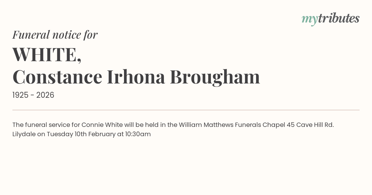 16°CThe funeral service for Connie White will be held in the William Matthews Funerals Chapel 45 Cave Hill Rd. Lilydale on Tuesday 10th February at 10:30am