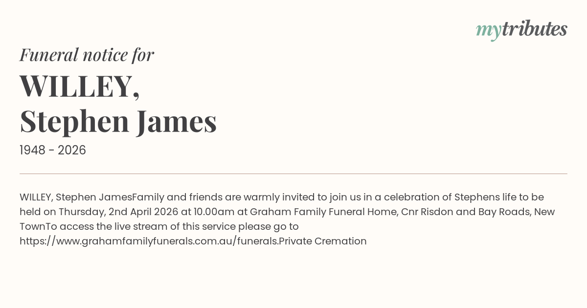 Family and friends are warmly invited to join us in a celebration of Stephen’s life to be held on Thursday, 2nd April 2026 at 10.00am at Graham Family Funeral Home, Cnr Risdon and Bay Roads, New Town