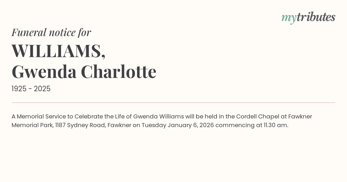16°CA Memorial Service to Celebrate the Life of Gwenda Williams will be held in the Cordell Chapel at Fawkner Memorial Park, 1187 Sydney Road, Fawkner on Tuesday January 6, 2026 commencing at 11.30 am.