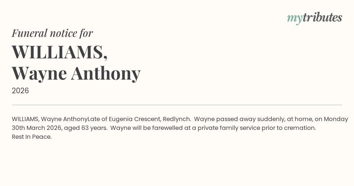 Late of Eugenia Crescent, Redlynch. Wayne passed away suddenly, at home, on Monday 30th March 2026, aged 63 years. Wayne will be farewelled at a private family service prior to cremation.