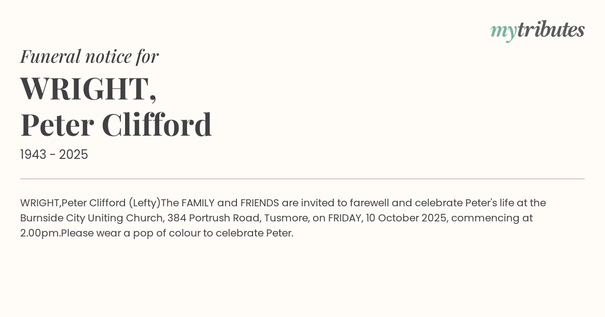 The FAMILY and FRIENDS are invited to farewell and celebrate Peter's life at the Burnside City Uniting Church, 384 Portrush Road, Tusmore, on FRIDAY, 10 October 2025, commencing at 2.00pm.