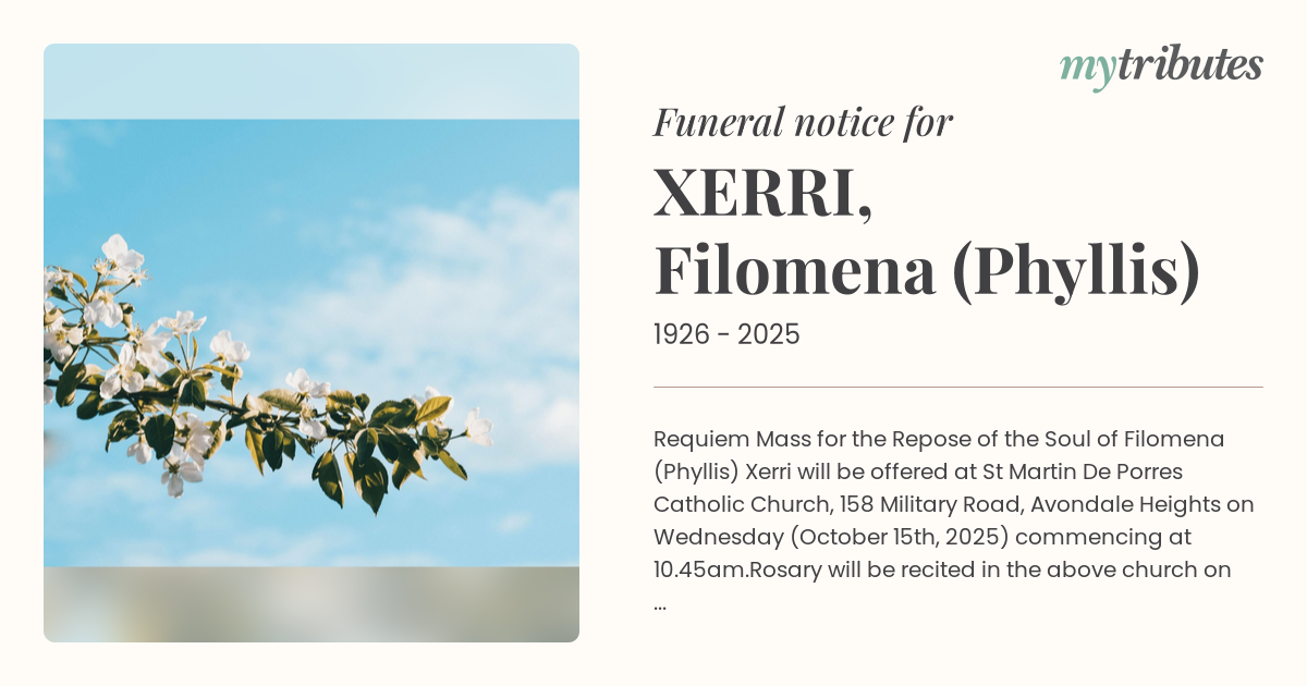 16°CRequiem Mass for the Repose of the Soul of Filomena (Phyllis) Xerri will be offered at St Martin De Porres Catholic Church, 158 Military Road, Avondale Heights on Wednesday (October 15th, 2025) commencing at 10.45am.