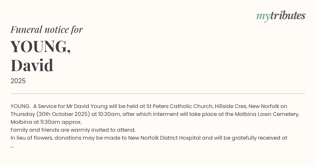 16°CYOUNG. A Service for Mr David Young will be held at St Peter’s Catholic Church, Hillside Cres, New Norfolk on Thursday (30th October 2025) at 10:30am, after which interment will take place at the Malbina Lawn Cemetery, Malbina at 11:30am approx.