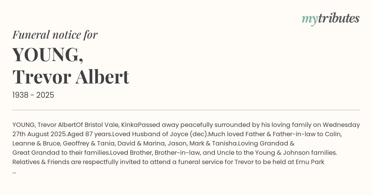 Relatives & Friends are respectfully invited to attend a funeral service for Trevor to be held at Emu Park Cemetery on Tuesday 2nd September 2025 commencing at 1pm.